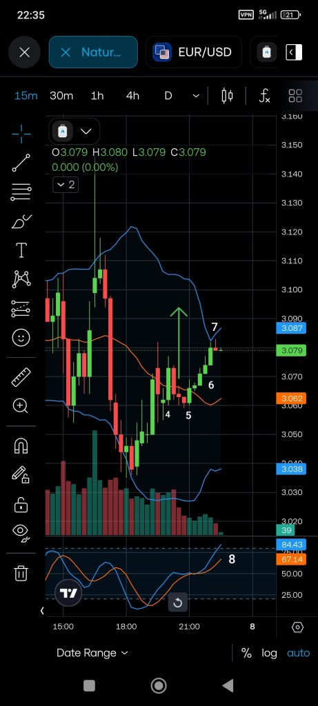 At marker 9: We saw the anticipated dip as European traders began entering the market. Take note of the timestamp – this was when the bears, who had been building momentum in the previous session, finally gained the upper hand. As trading volume gradually increased, the bears temporarily won the battle, creating that expected small decline (-0.030). I monitored the RSI closely, prepared to close my long position and accept the loss if necessary. But then it took off again where it almost reached my taking-profit target (3.100) at the time of the snapshot but the RSI told a different story.