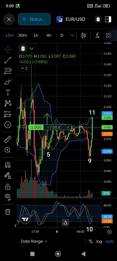 A doji star (especially after a big move) screams “indecision!” – when bulls and bears arm-wrestle to a draw. The tiny body + long wicks = reversal warning. According to an ancient Trader proverb: ” When doji appears at highs/lows, smart money reaches for the exit door”. In this case it looked like they’re temporary getting out of shorts. The big green candle after the doji means: Bullish Breakout Confirmed. No more hesitation. Short after, I decided to closed my short at 3.080. (+ €1.71 NET). FOMO kicks in and I decided to enter long (19:33:14 CET).